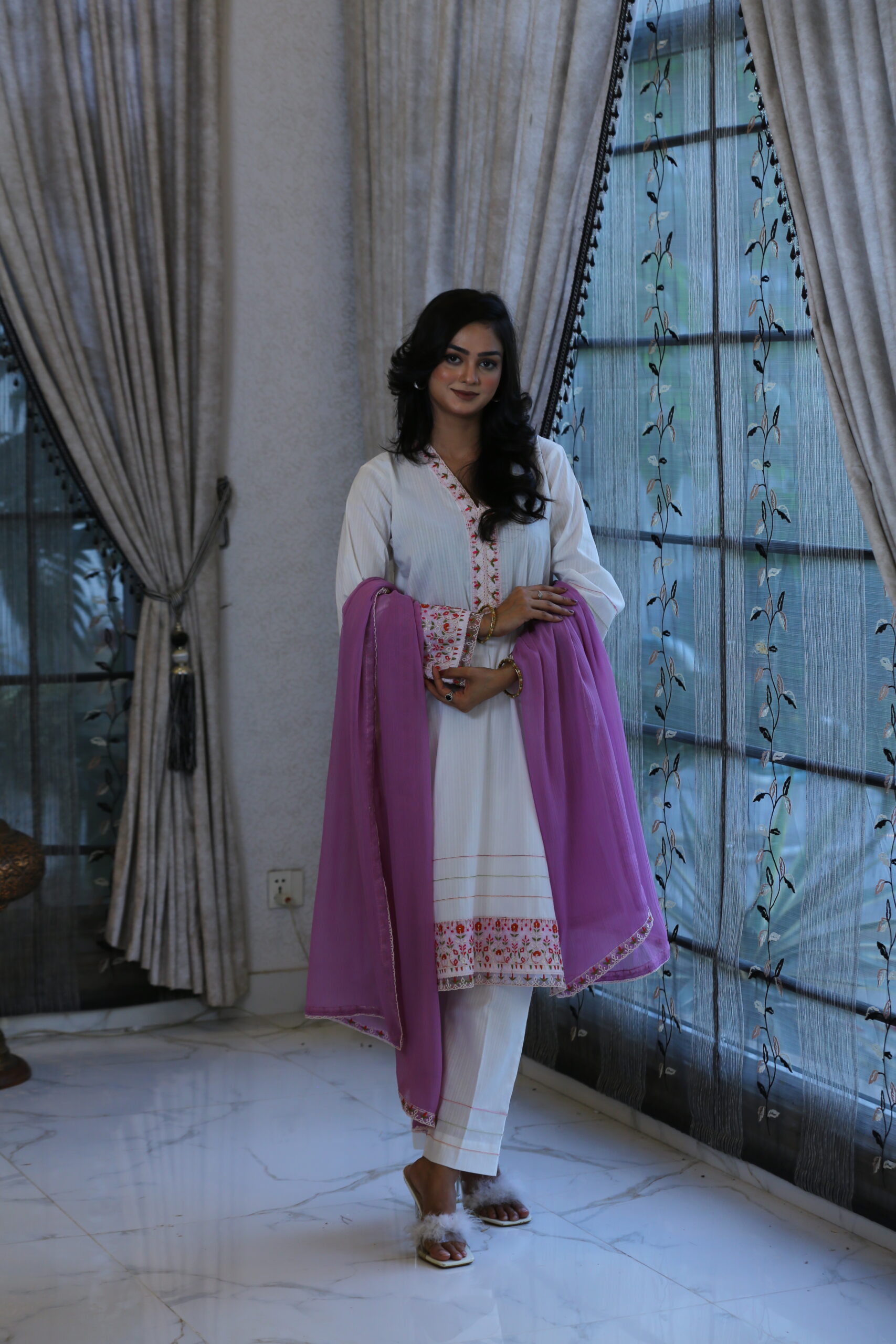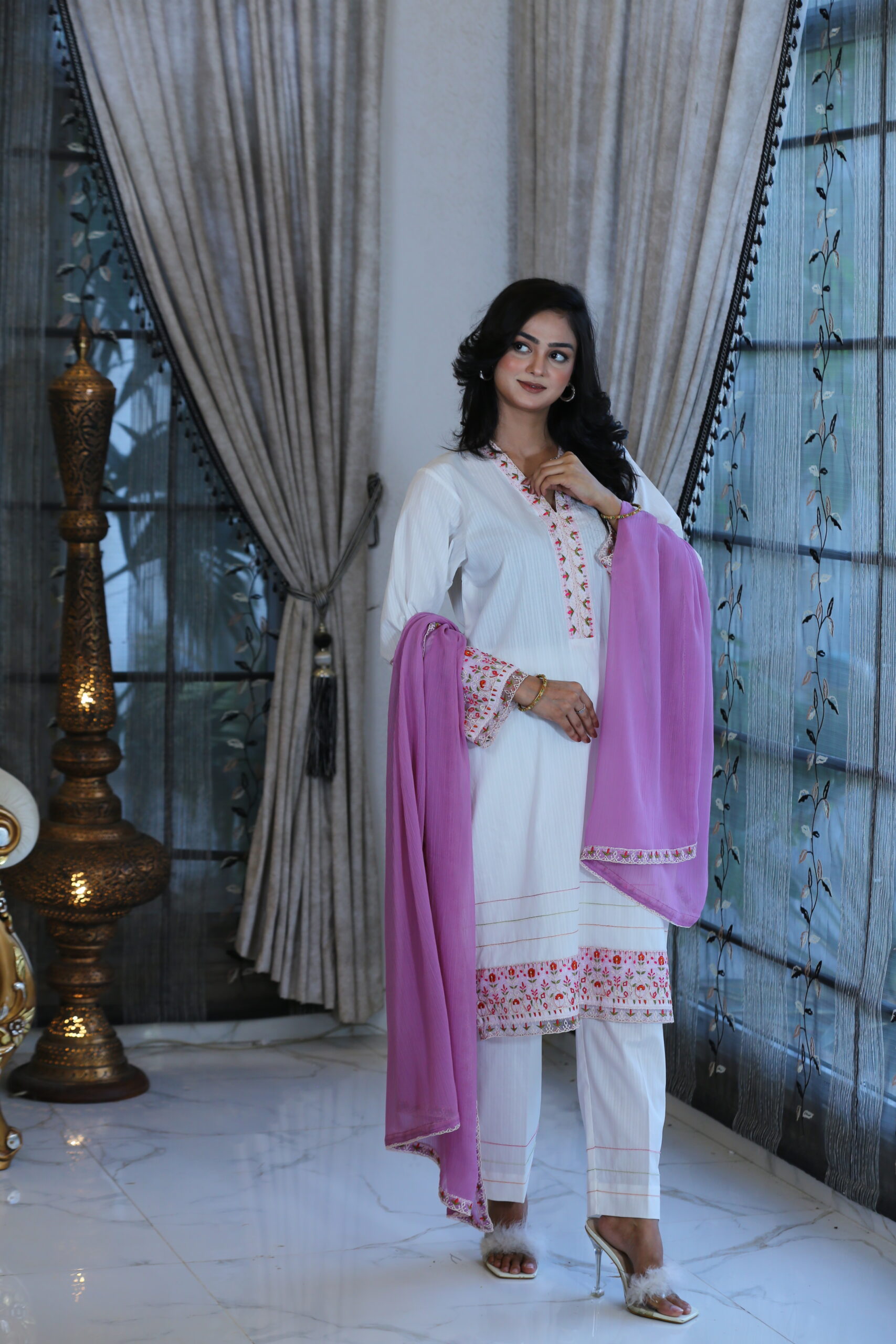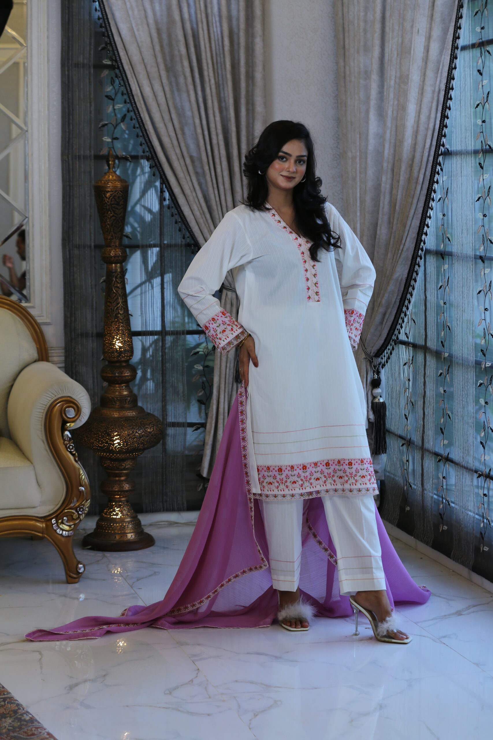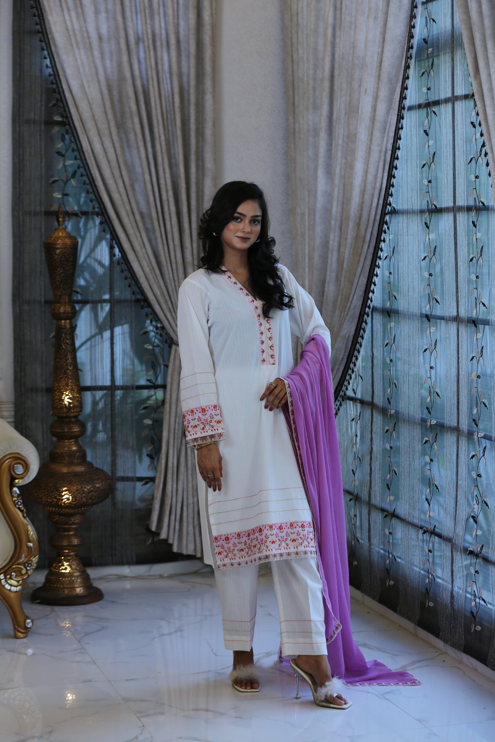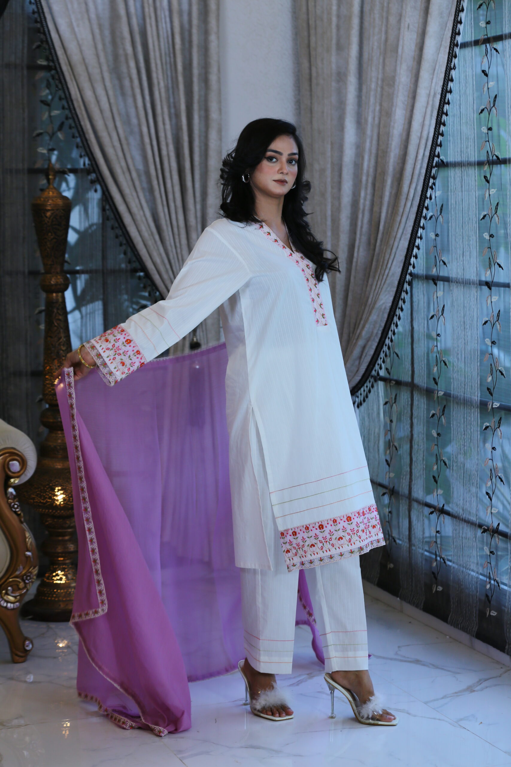 - Doriya lawn shirt adorned with delicate embroidery on the neck, daman, and sleeves, crafted with refined artistry.
