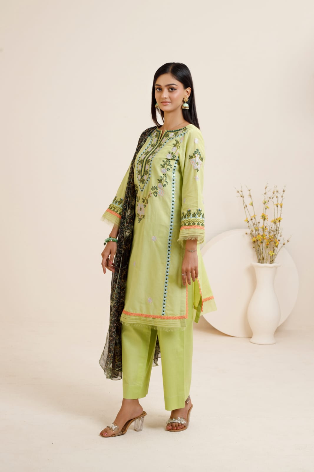 - A printed chiffon dupatta adds movement and a touch of artistry to the look.