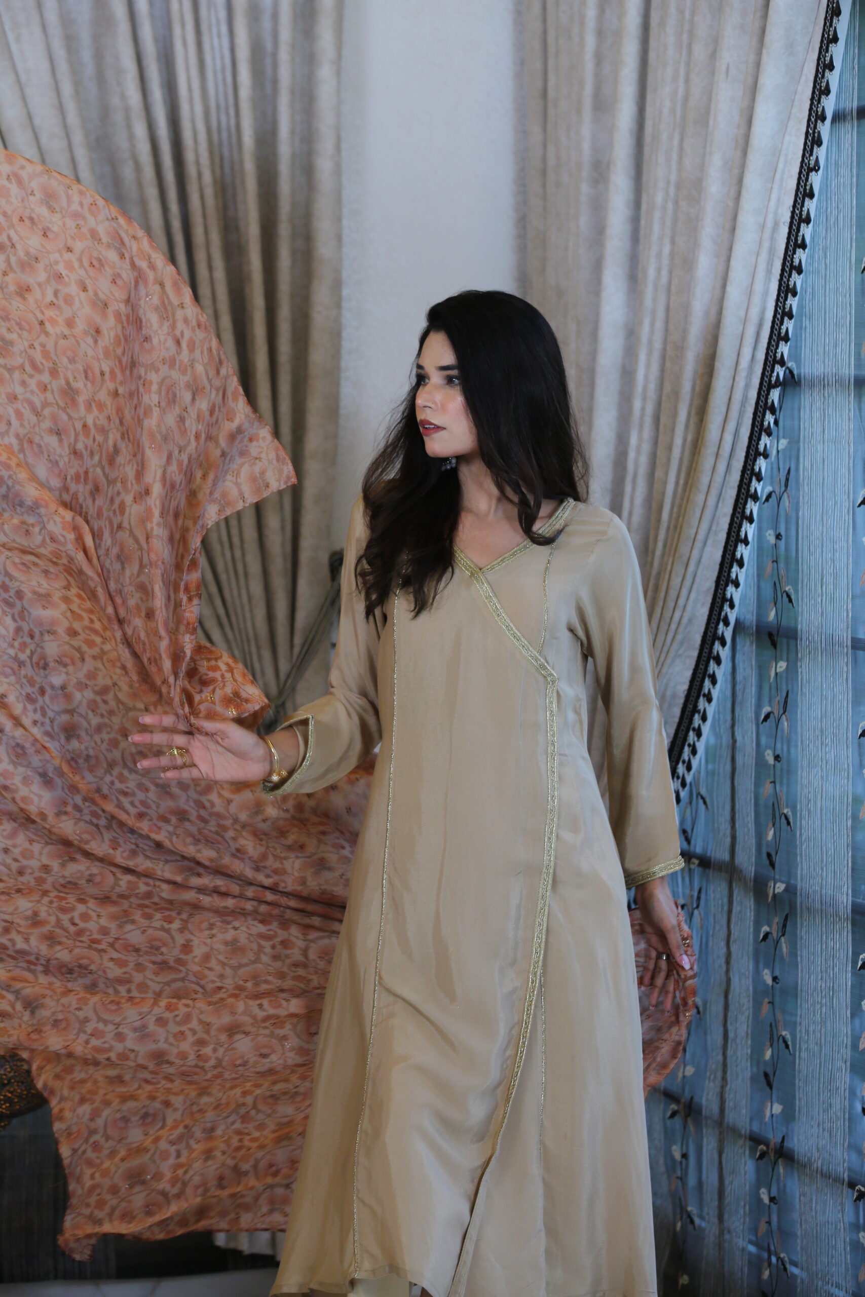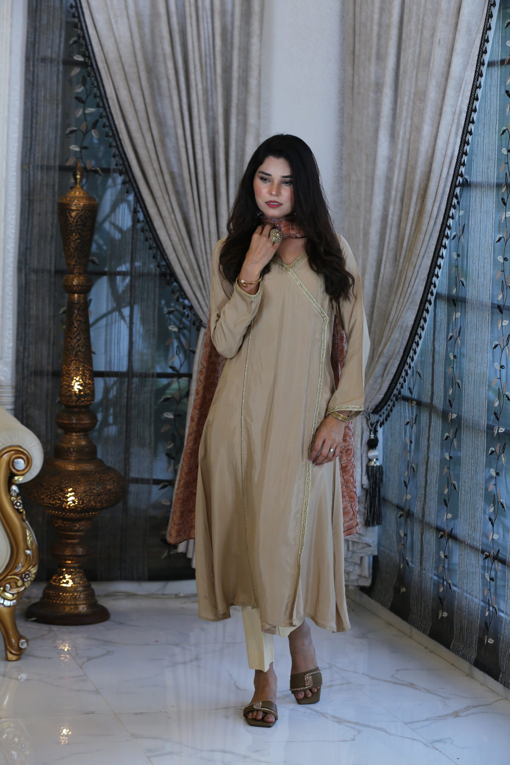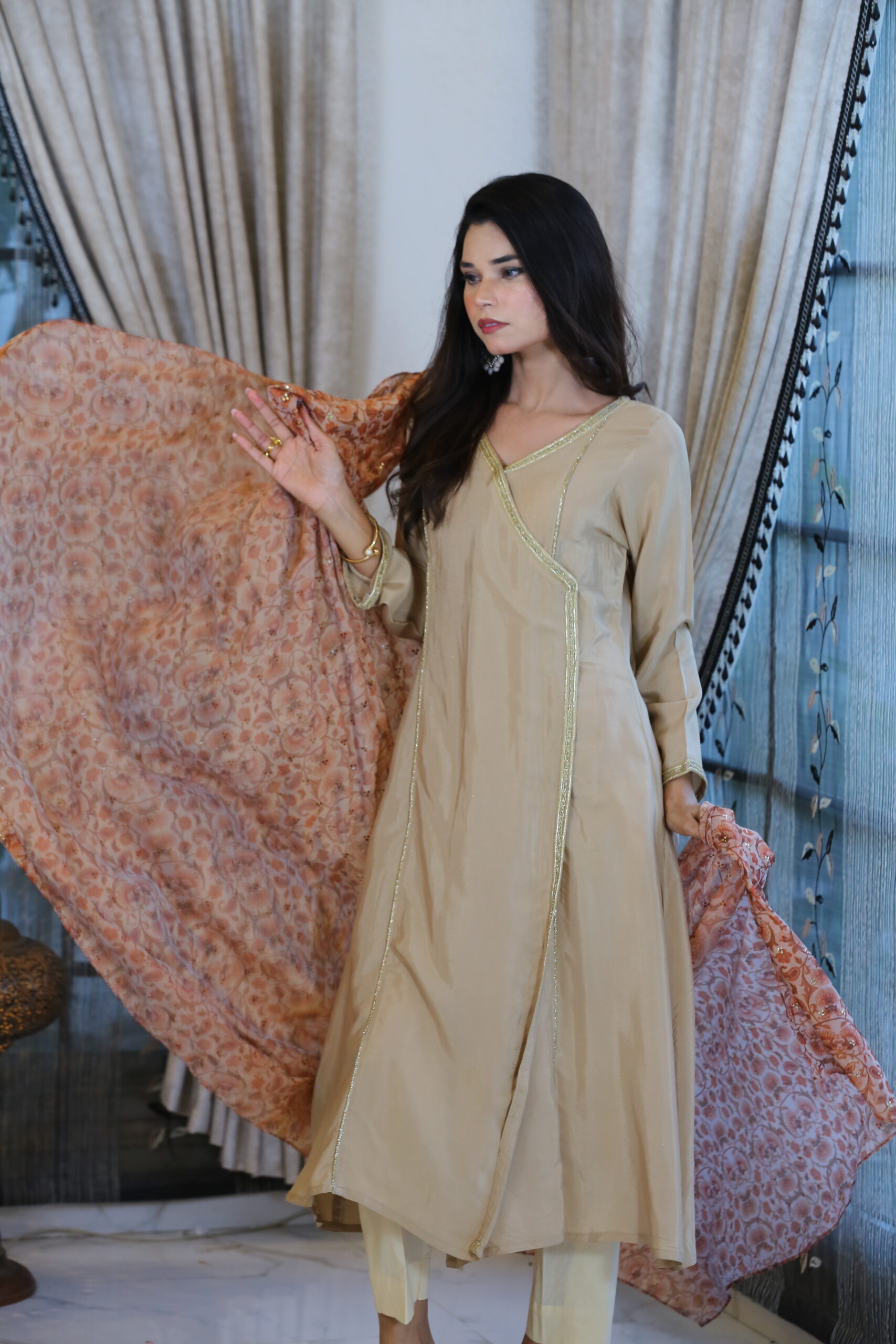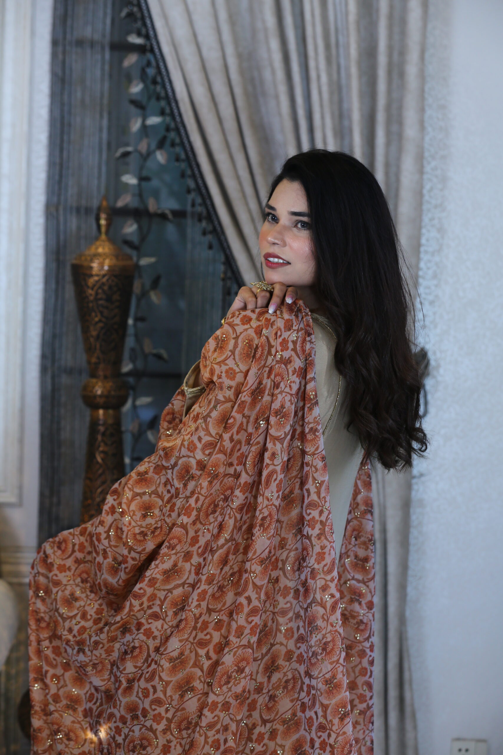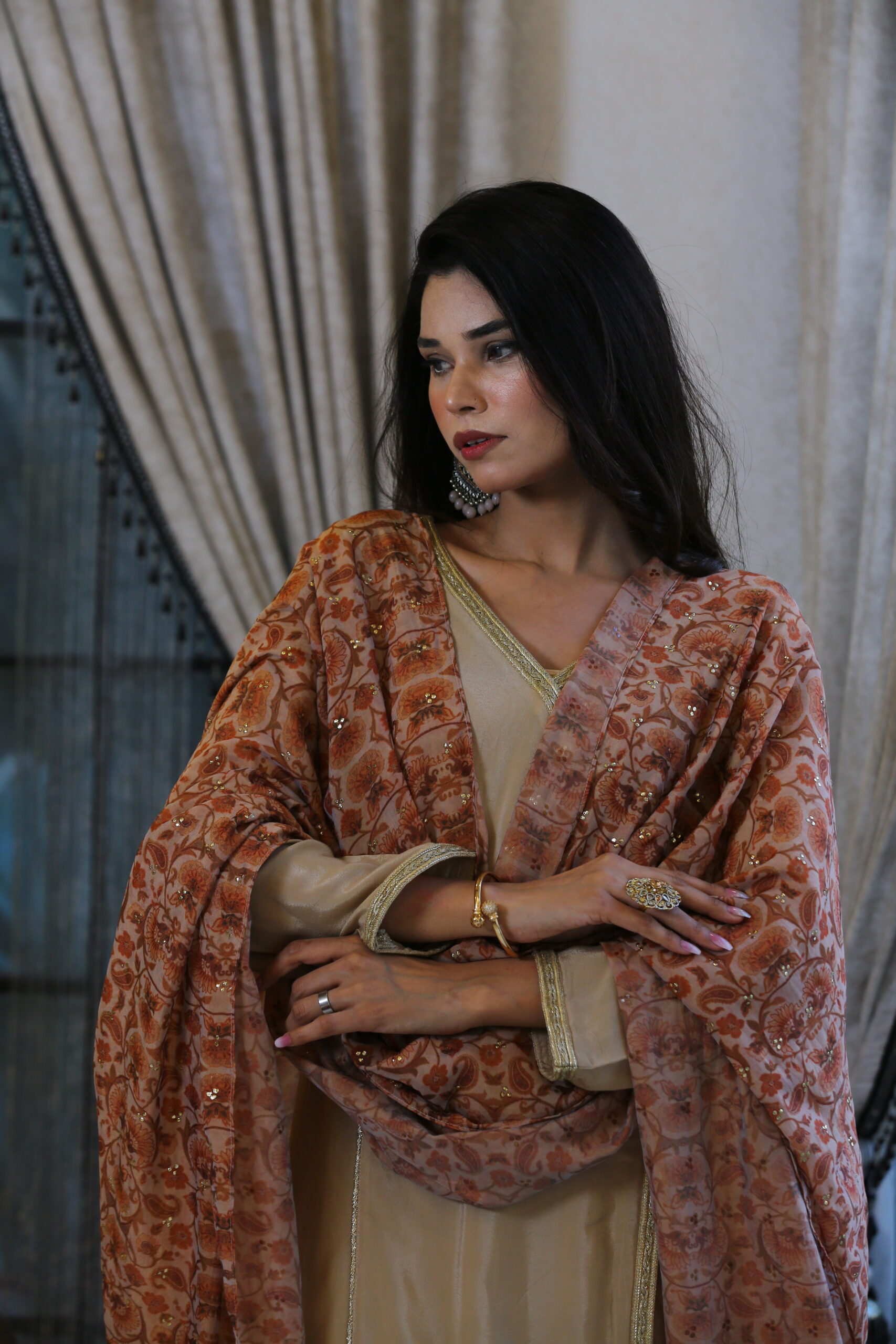 - Paired with a printed georgette dupatta, softly embellished with Kamdani work, adding shimmer to subtlety.